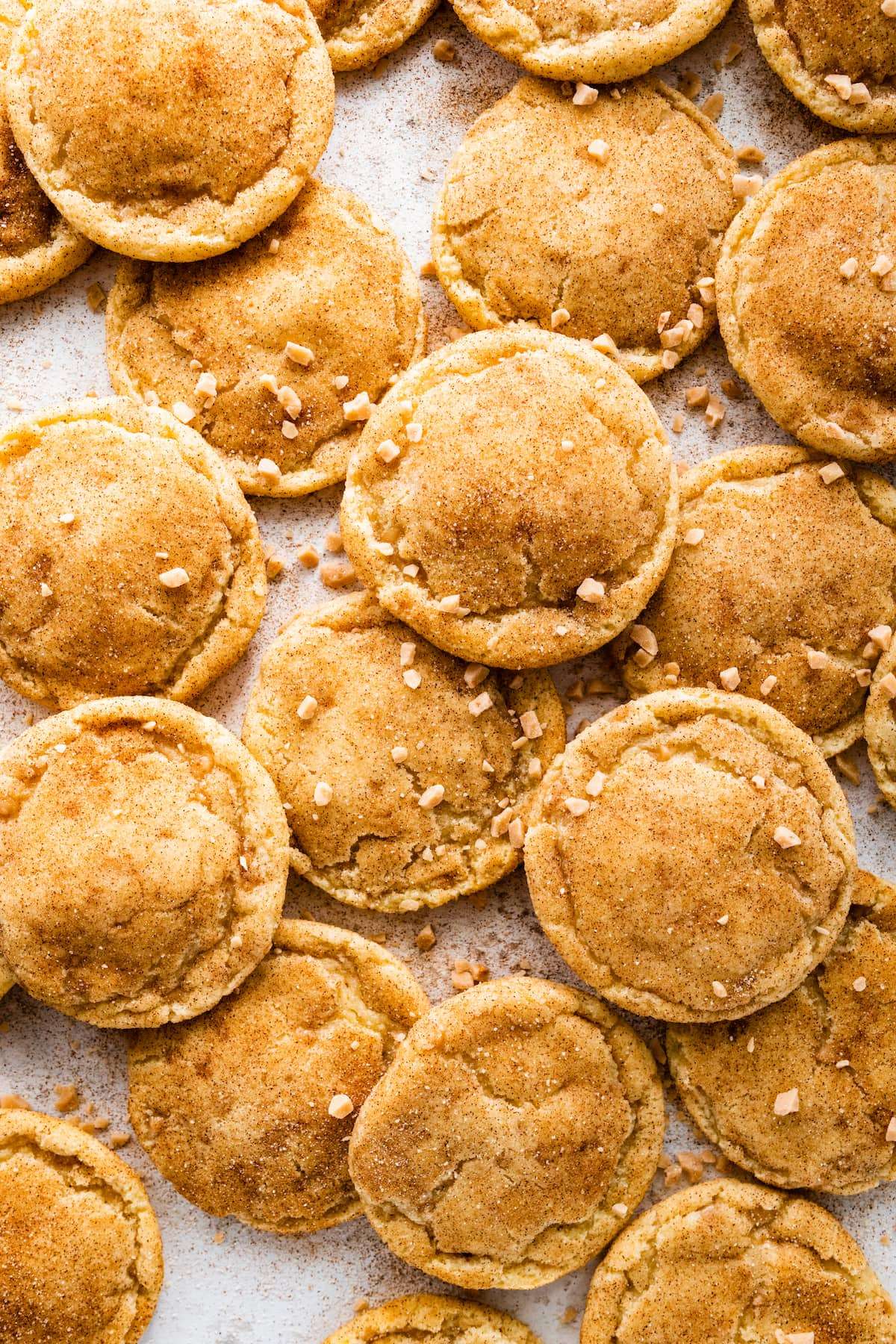 Soft and chewy snickerdoodles dotted with toffee bits and rolled in cinnamon sugar. If you like Starbucks toffeedoodle cookies, you will LOVE my recipe. I think they are even better!