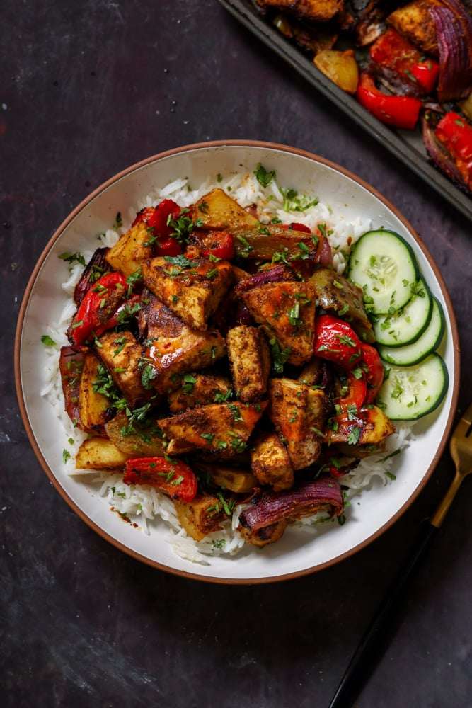 - Once everything is baked to preference, remove it from the oven. For extra crispiness, you can broil it for a minute or two, and then remove it from the oven. Serve this tofu tray bake any which way you like! See notes for suggestions.