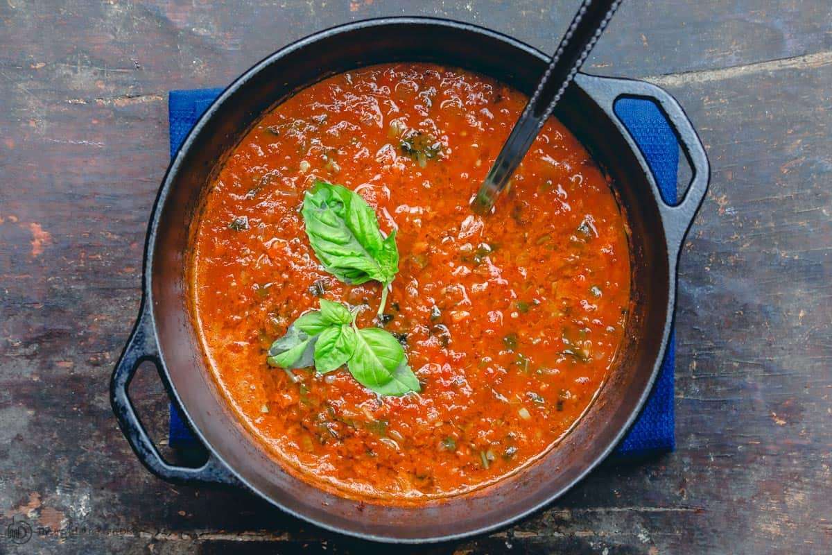 - Add the tomatoes and reduce. Pour the roasted tomato mixture into the pot with the onions. Stir in the crushed tomatoes, basil, thyme, oregano, paprika, cumin, and 2 ½ cups of water. Season with salt and pepper. Bring to a boil, then lower the heat and cover, leaving the lid slightly ajar to allow some steam to escape. Let simmer for about 20 minutes or so.