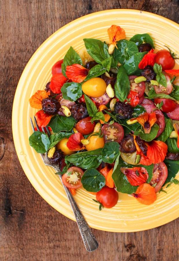 Fresh-picked tomatoes, slices of dates and a handful of pistachios. The sweet and salty additions pair well with the spicy nasturtium and add a contrasting textures to the salad.