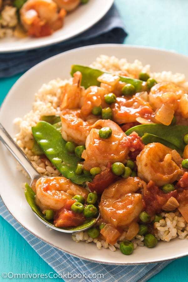 - Add snow peas and green peas. Continue cooking and stirring until the snow peas start to turn tender, and the shrimp are cooked through. Carefully taste the sauce and adjust seasoning if necessary. Transfer everything to a plate.