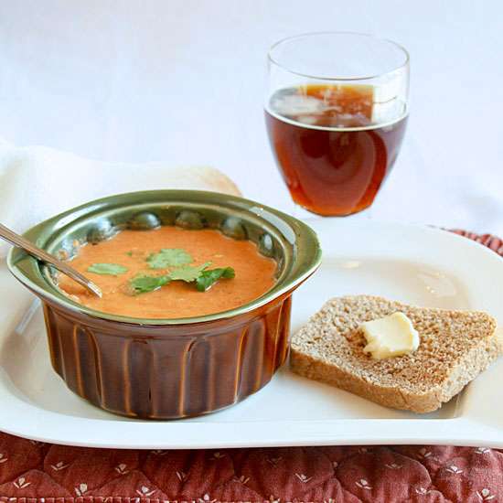 Cream rich Tomato Stilton soup blends savory tomato with sharp blue cheese, yet is under 150 calories per bowl. Who said healthy is hard!