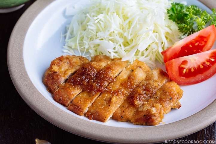 - If you eat with chopsticks, transfer the meat to a cutting board and slice it into bite-size pieces. Serve the Tonteki with the shredded cabbage and tomatoes. Pour the extra sauce over the cabbage, if you‘d like. Garnish with parsley (optional).