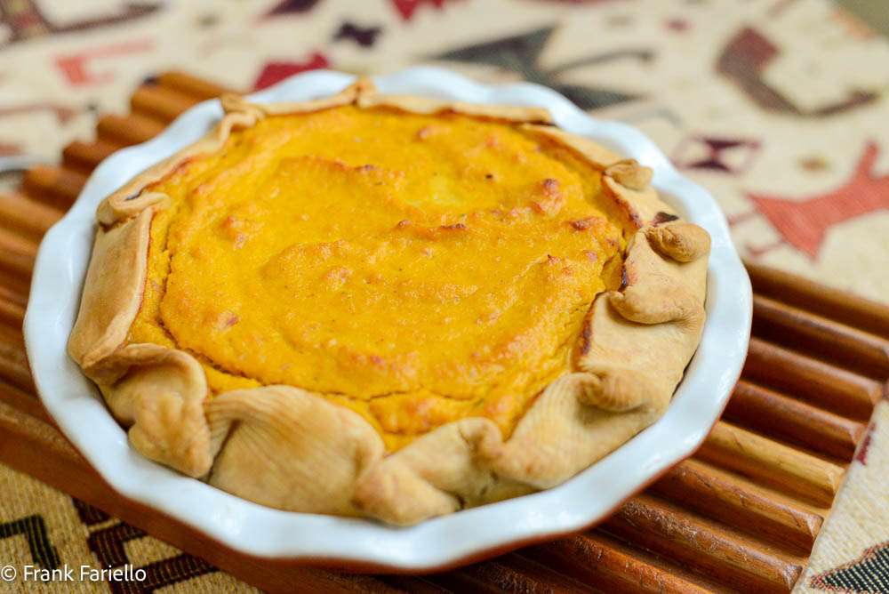 - Line a well greased pie plate or quiche dish with the pastry, letting an extra dough hang over the sides. Pour in the filling and flatten it out with a spatula. Now you can fold any extra pastry dough back over the filling, or braid it to form a decorative [border] or just trim it off, as you prefer.