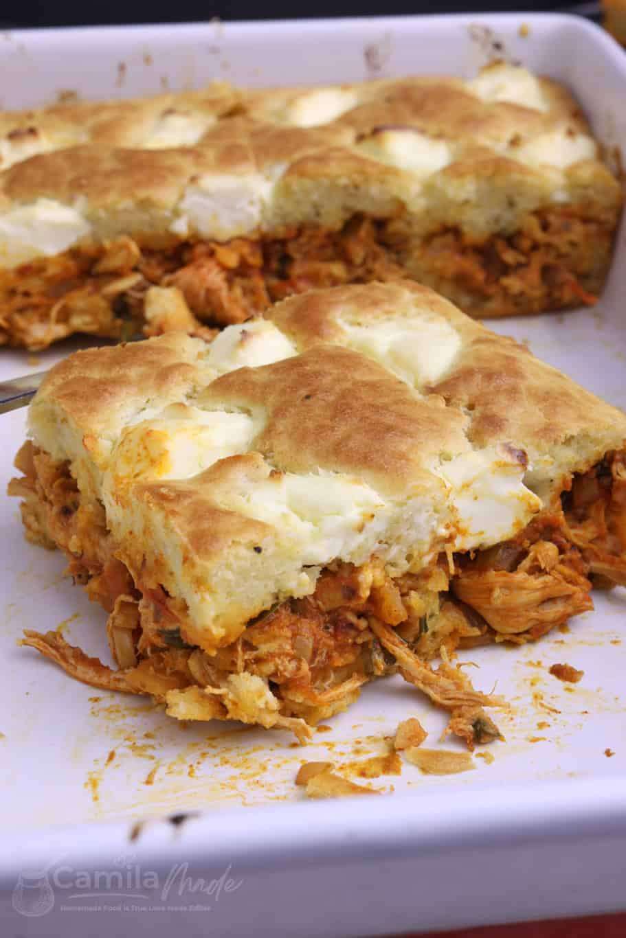 - Bake the savory rotisserie chicken cake for about 45 minutes or until a toothpick inserted in the middle comes out clean. Remove the Torta Salgada from the oven and let it cool for 10 minutes. Cut it into squares and serve warm. Enjoy!