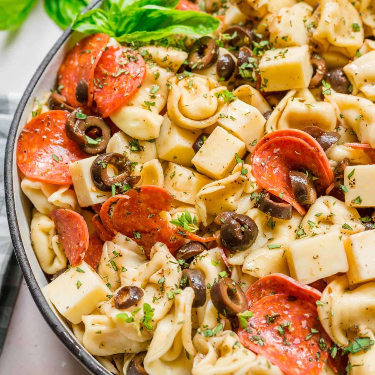 This easy Tortellini Salad is the best Italian pasta salad! Cheese tortellini, black olives, mozzarella cheese, and pepperoni in a simple Italian dressing.