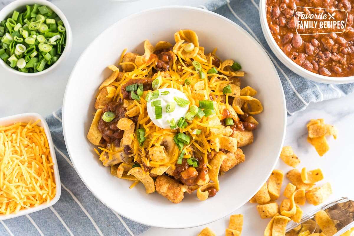 - Top each bowl with cheddar cheese, sour cream, and green onions.