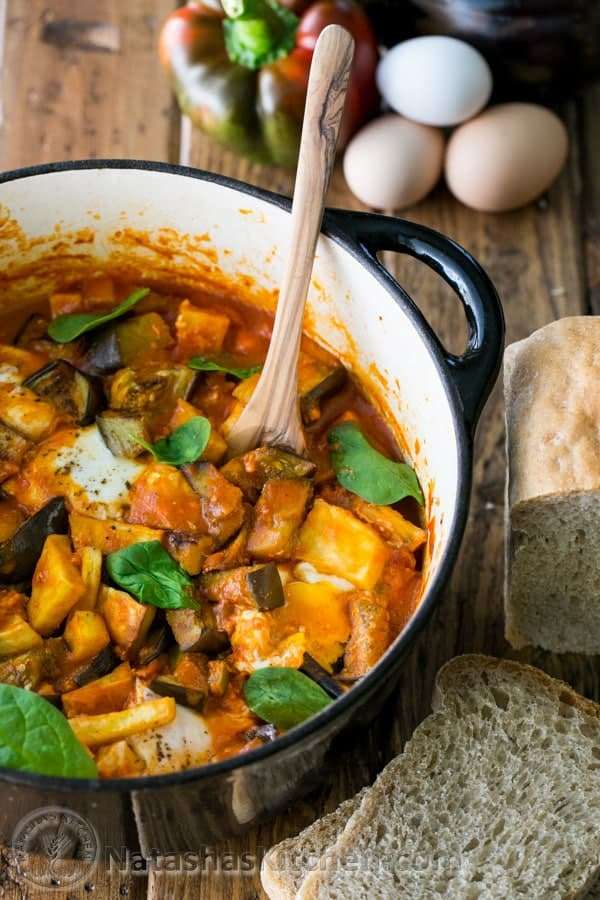 - Add the baked eggplant & potato around the eggs. Reduce heat to med/low then cover and cook an additional 6-8 minutes to let eggs cook through. Keep an eye on the eggs every 1-2 minutes and continue cooking until egg whites are cooked through and yolks are the desired doneness. Get your crunchy/soft French bread and get ready to dip!