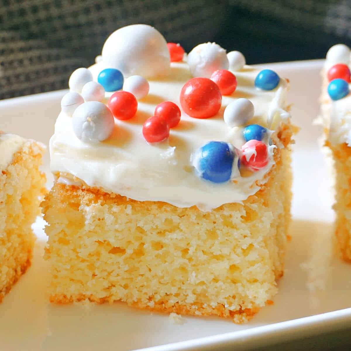 Traybake Sponge Cake with Cream Cheese Frosting and blue, red and white sprinkles for a patriotic touch, a fantastic cake if you are looking for 4th July dessert ideas for a crowd. Both the sponge and the cream cheese frosting have a delicate vanilla flavour, and are ridiculously easy to make with a handful of ingredients.