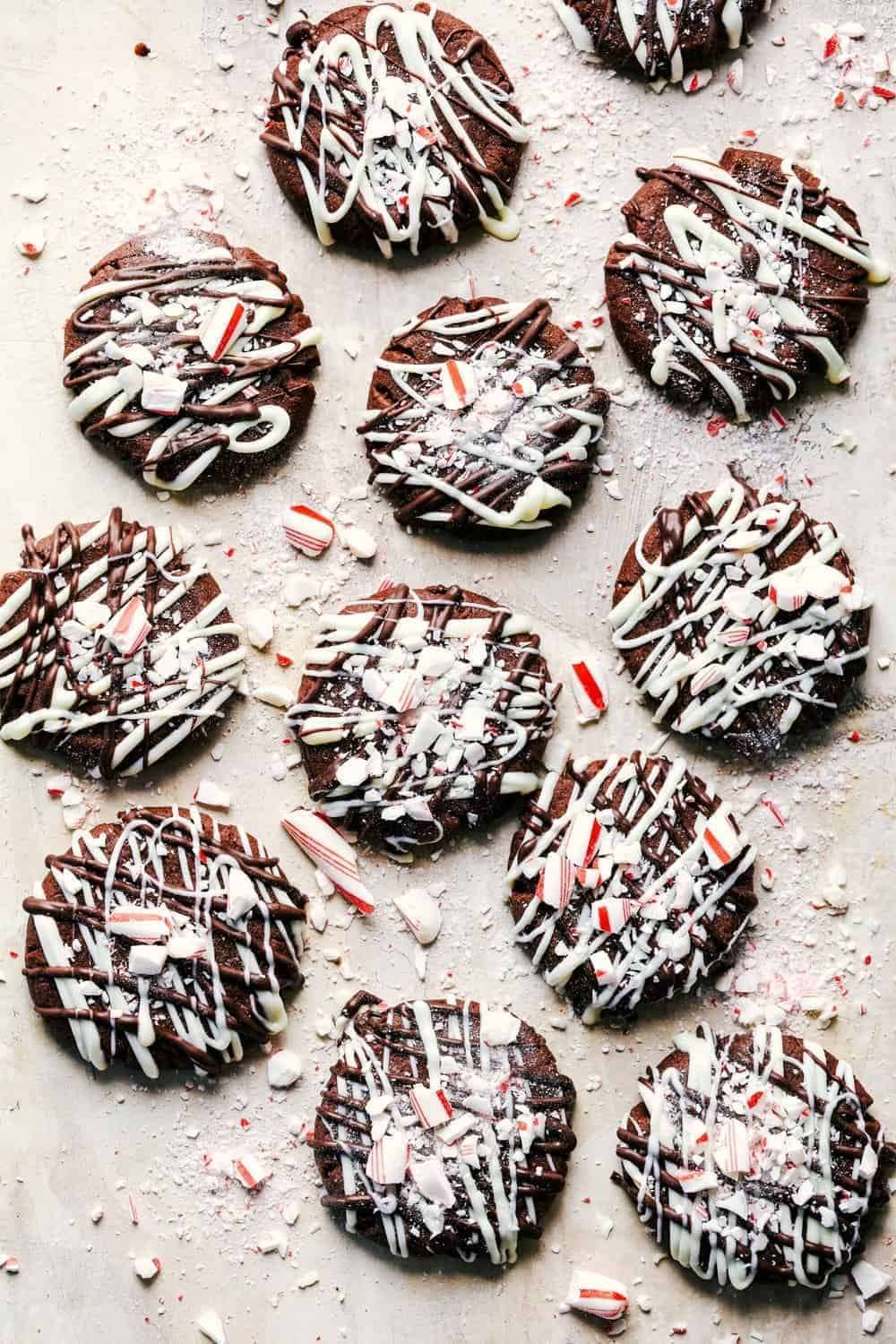 Triple chocolate peppermint cookies are soft and chewy cookies that get drizzled with white and dark chocolate. They are topped with crushed candy canes and are the perfect treat for the holidays!