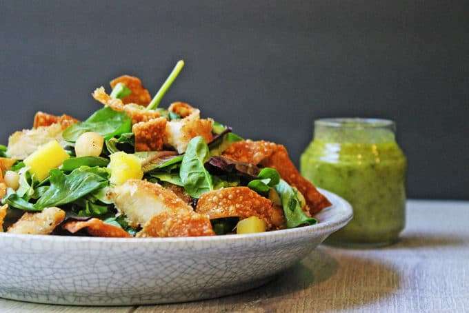 This salad is made of the leftovers from my Macadamia Crusted Chicken with Pineapple Jalapeno Salsa and topped with pineapples, macadamia nuts and freshly made crispy wonton strips.