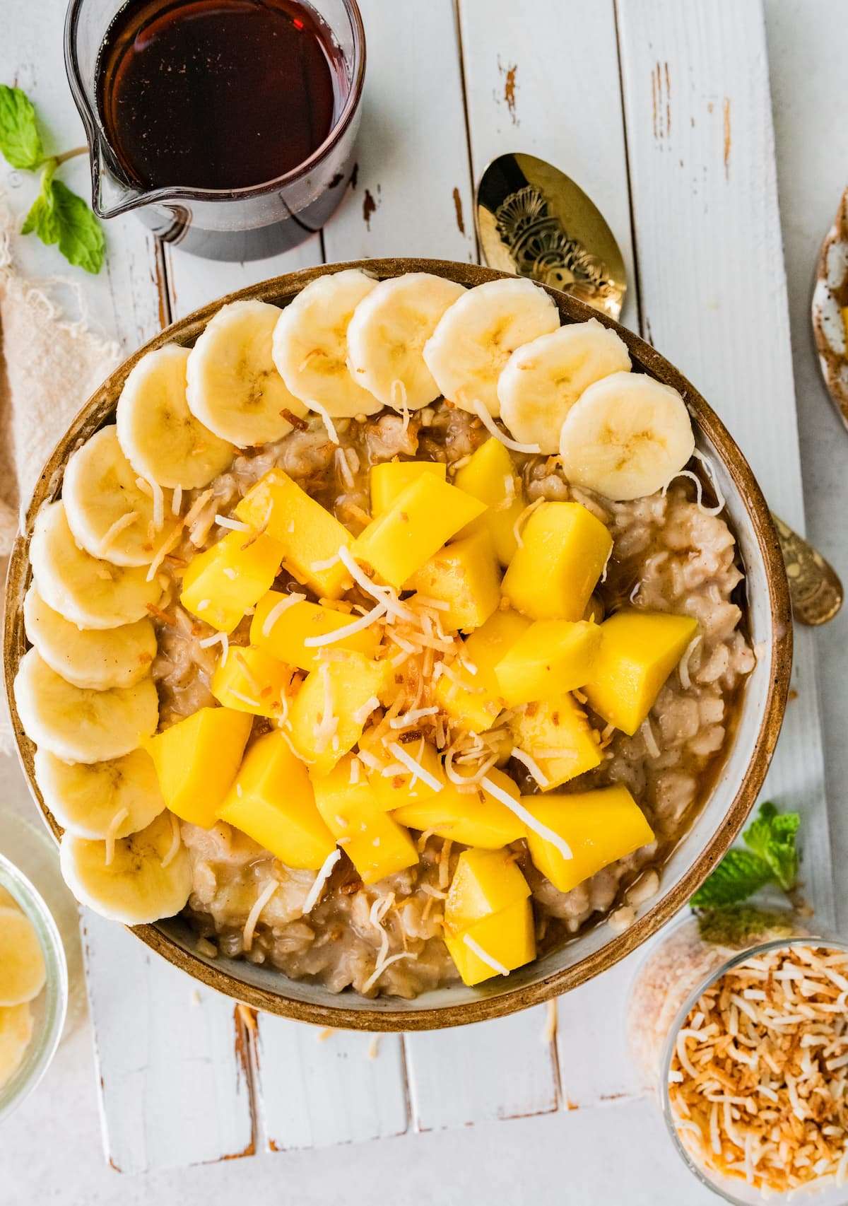 This creamy bowl of tropical oatmeal cooks up in under 10 minutes on the stovetop. It combines rolled oats with coconut milk and banana and is topped with fresh mango and toasted coconut.