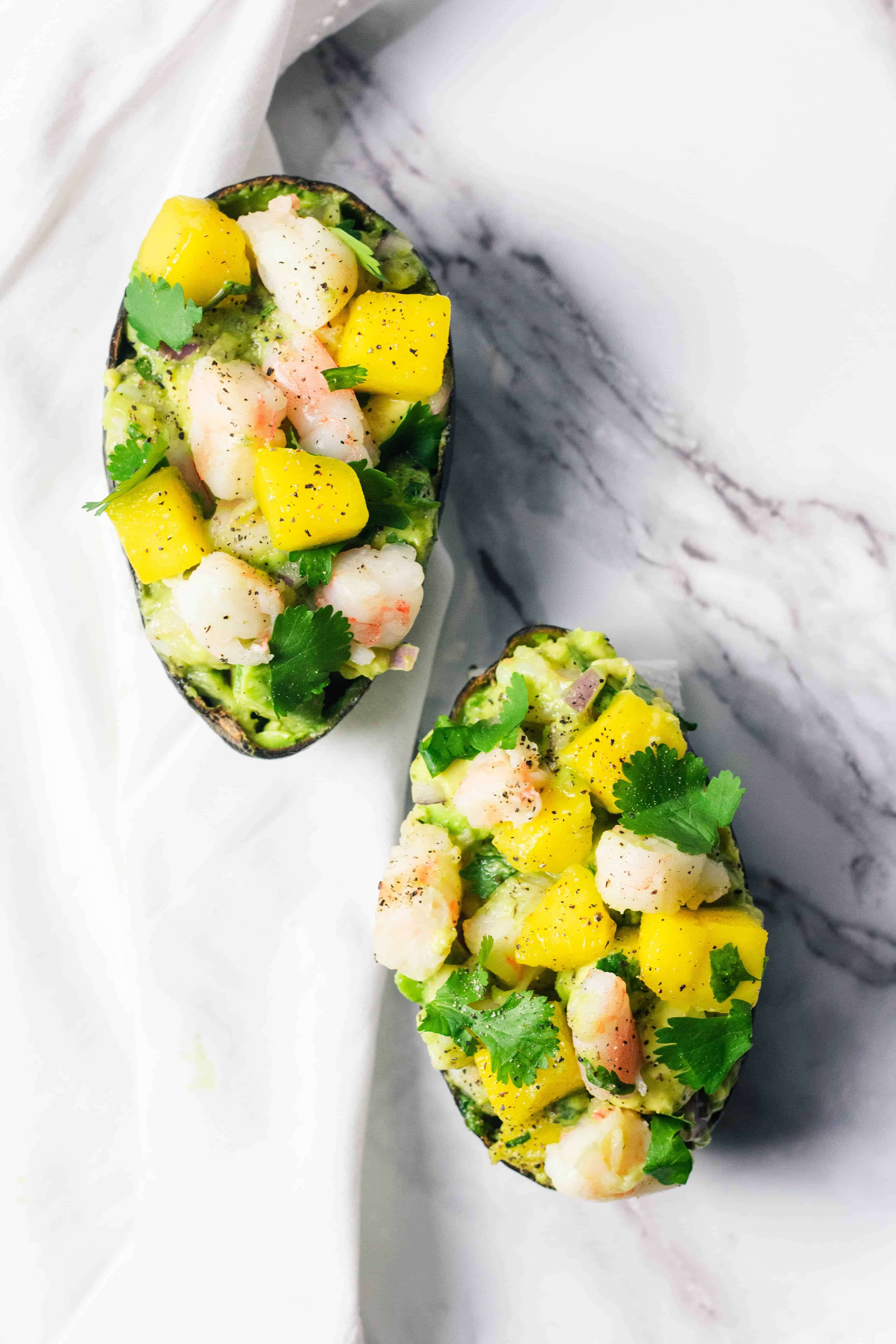 These Tropical Stuffed Avocados feature the fresh flavors of the beautiful Caribbean. Avocado, mango, shrimp, and red onions combine to make a tropical, healthy, flavorful, and quick dinner. What more could you want?!