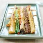 - Heat a large pan with a little bit of oil over medium low heat. Place the skewers in the pan. Cook each side until the meat and vegetables are cooked through and slightly caramelized, 1 – 2 minutes each side. Garnish with the optional sesame seeds or pine nuts.