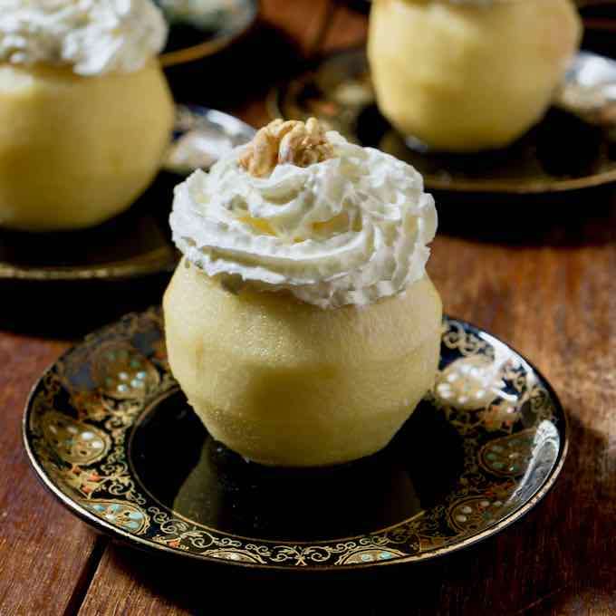 Los tufahije son un postre bosnio hecho con manzanas rellenas de nueces y hervidas en agua azucarada, que también son muy populares en Serbia y Macedonia.