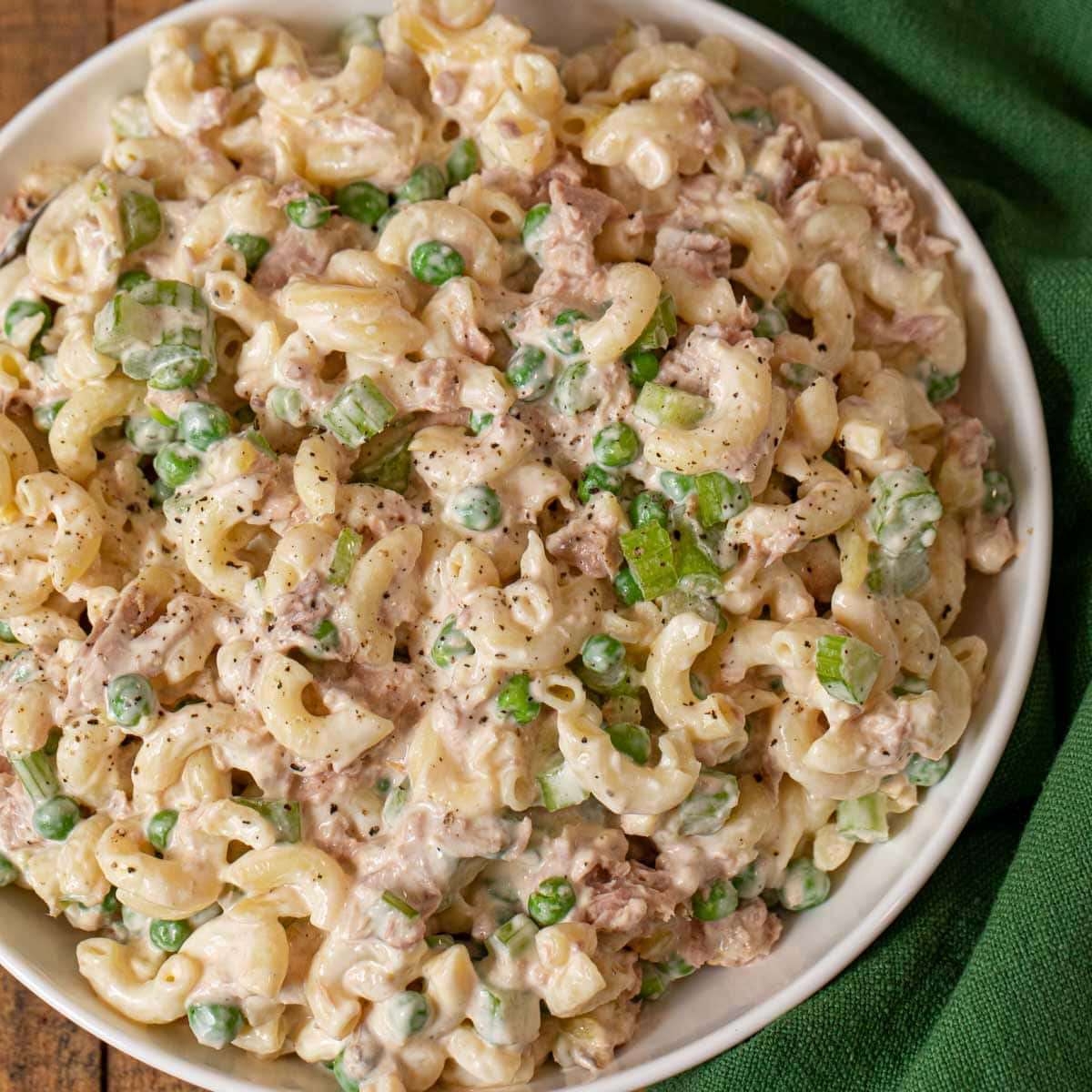 Tuna Pasta Salad is an easy lunch or side that's refreshing and perfect for spring or summer. With elbow noodles, tuna, peas, lemon juice, and celery.