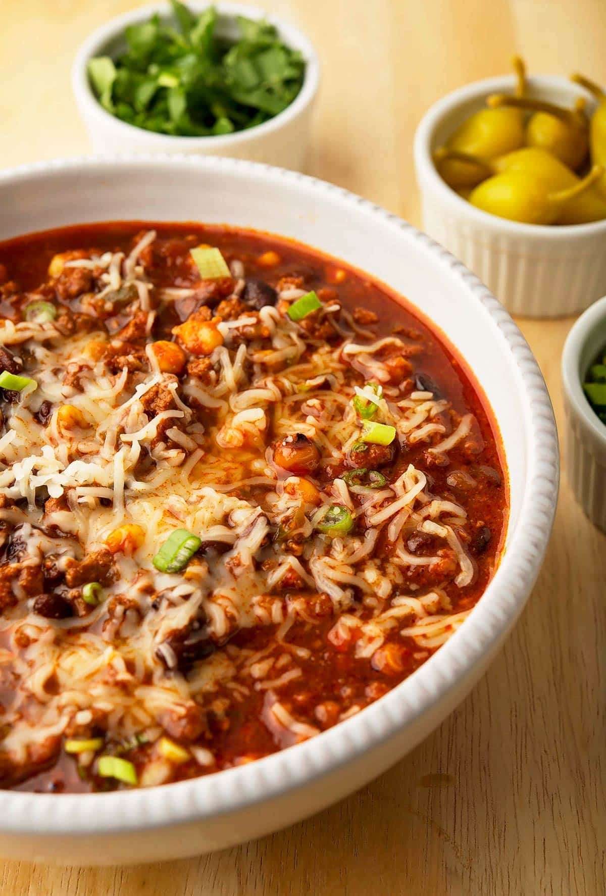 This recipe can be done in as little as an hour if you use the shortcuts, but I do prefer it cooked with the dry ingredients slow and low. Either way works well. Serve your chili with cornbread, rice or crusty bread.