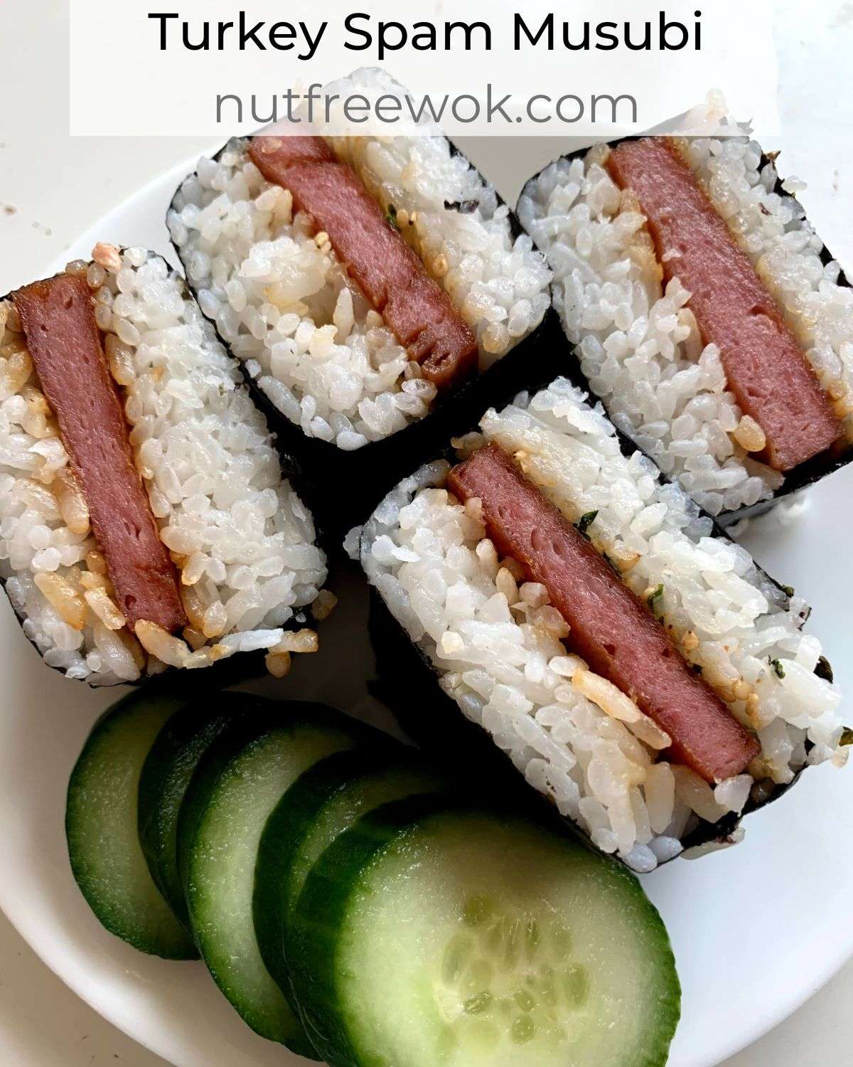 Turkey Spam musubi is leaner version of a Hawaiian treat Spam musubi, a piece of pan fried and seasoned Spam with rice, wrapped with nori.
