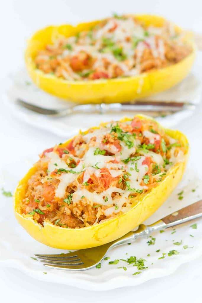 - Place the spaghetti squash shells on a large baking sheet and fill with the turkey mixture. Top each with 2 tablespoons grated cheese.