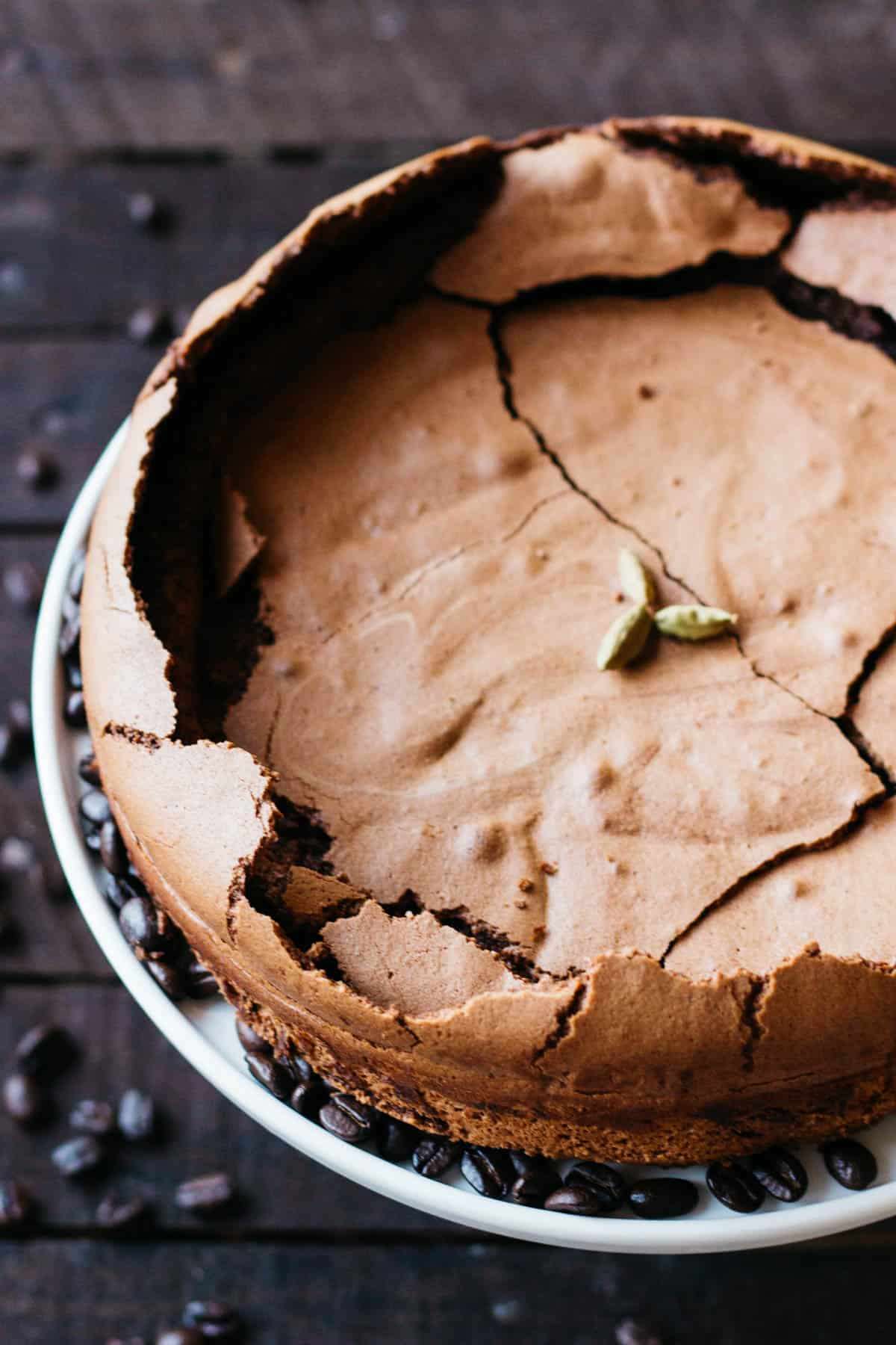 This recipe for Turkish Coffee Flourless Chocolate Cake is flavored with coffee and cardamom for a unique twist on a classic chocolate cake. It's a rich and luxurious dessert that's gluten/grain free, dairy free optional and can be made in under an hour.