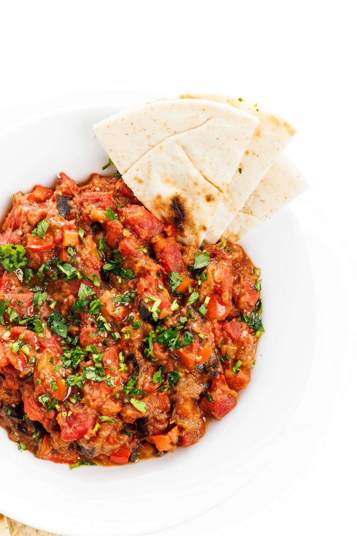 This smoky eggplant dip made with tomatoes and red peppers can be served hot, cold or room temperature.