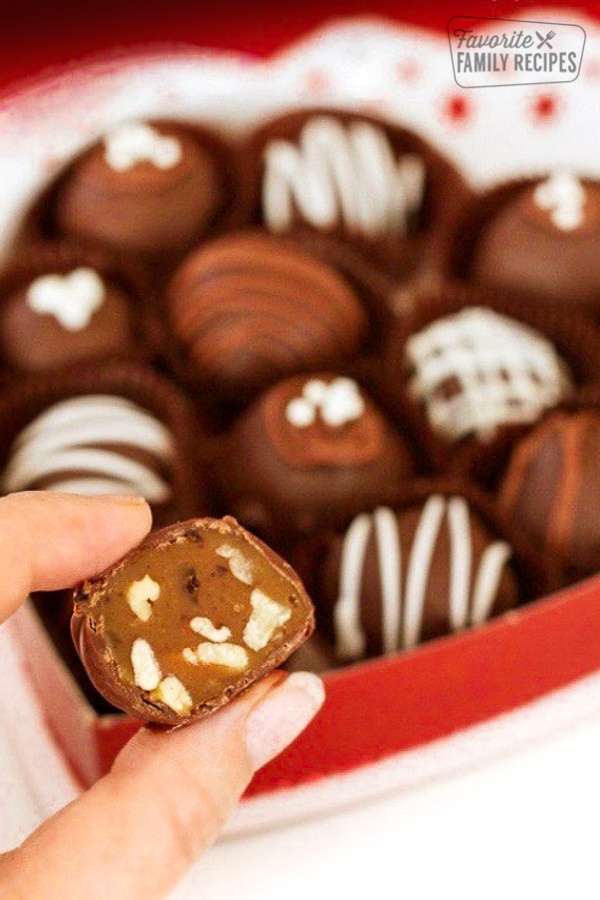 - Cool for about 30 min, cover with plastic wrap, and then place in refrigerator until ready to roll and dip. When caramel is cooled and easy to handle, cut into 1/2 - 1" squares and roll into balls (should make about 60+ balls)
