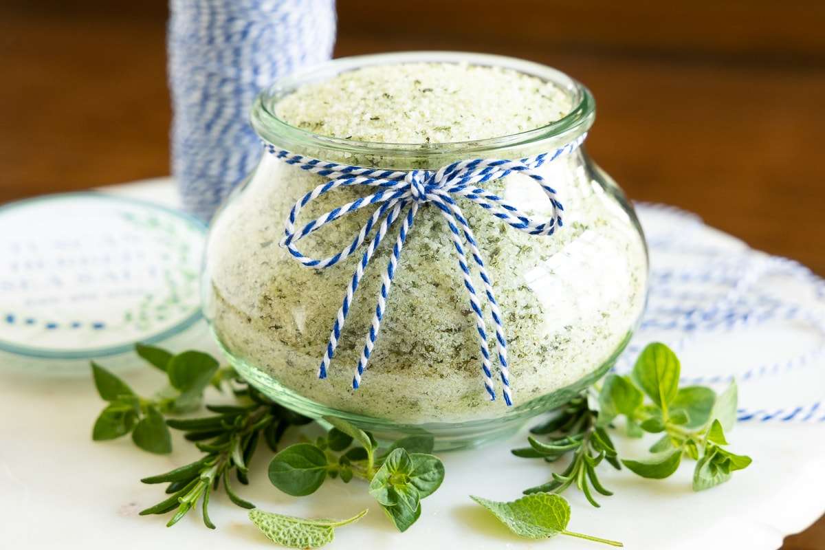 - Combine all of the chopped herbs in the bowl of a food processor (I use my mini food processor). Add ¼ cup of the fine sea salt. Pulse until everything is finely chopped and the consistency is like slightly damp sand.