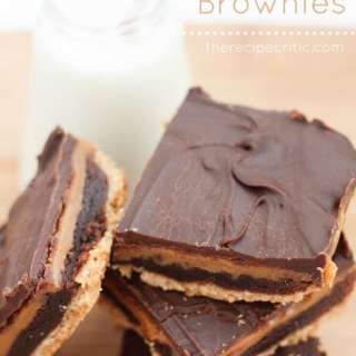 - CHOCOLATE LAYER: Place chocolate chips and shortening in a microwave-safe bowl. Microwave in 30 second increments until melted. Pour over caramel layer. Place in fridge to let brownies set before slicing and serving. Enjoy!
