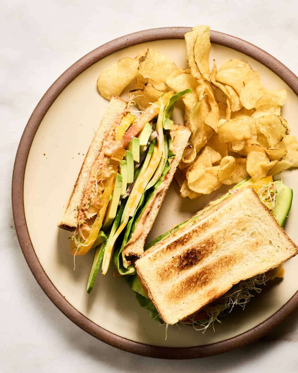 This ultimate veggie sandwich is full of bright colors, crunchy textures and a red pepper hummus that is so delicious and flavorful. It takes mere minutes to throw together and is perfect for a picnic, day at the beach of work from home lunch.