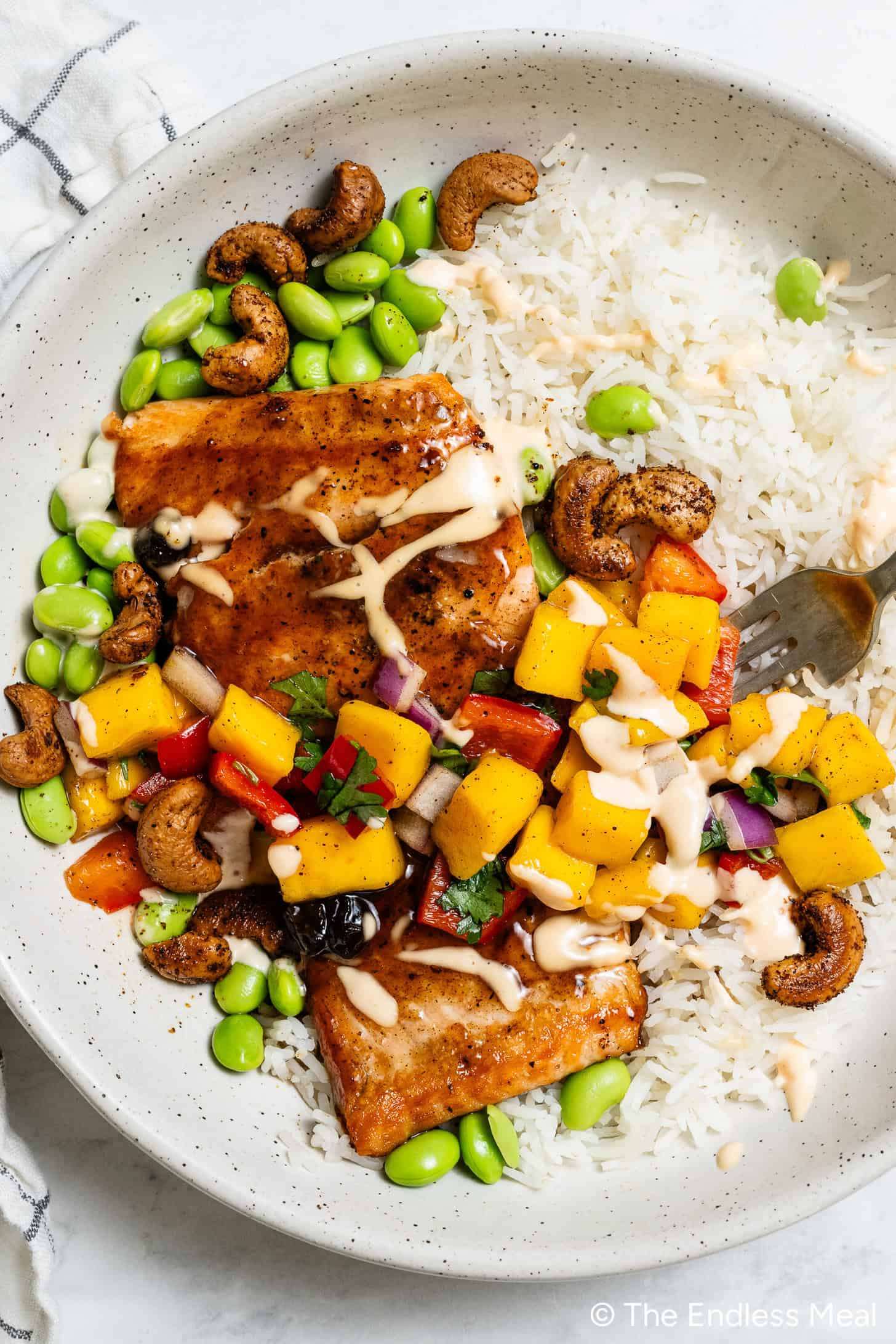 - Serve the salmon on top of rice with the mango salsa on top, and some edamame, sriracha mayo and cashews.