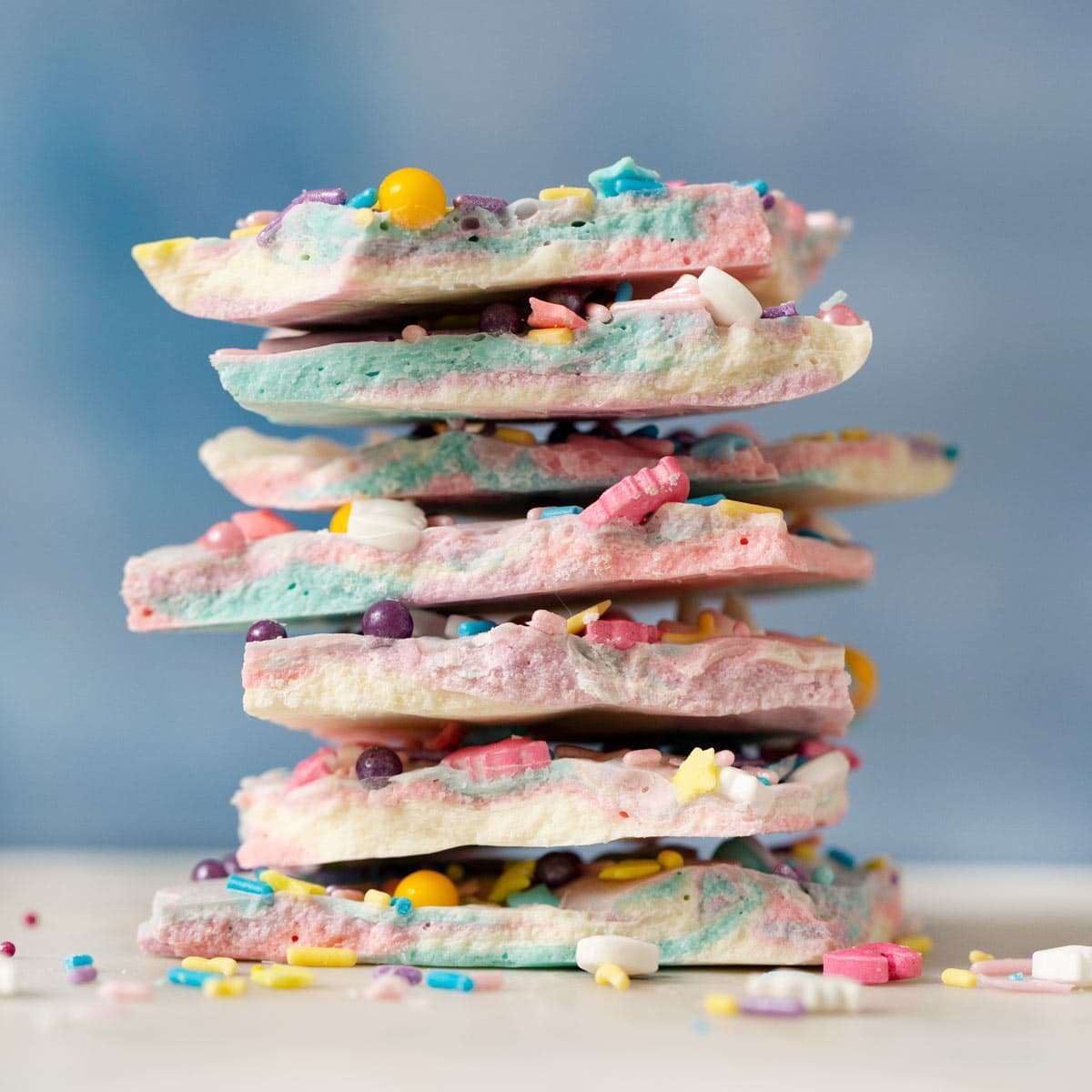 Unicorn Bark is a fun treat with sweet pastel rainbow colors and sprinkles perfect for birthday parties. Super easy to make with 4 colors marbled together.