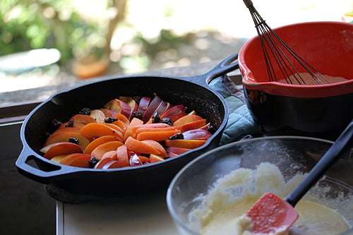 You have some latitude with the fruits that you use. Just make sure that whatever you use covers the bottom in a substantial layer, around double-thickness, since the fruit will cook down while baking and settle nicely into place. Berries and such are good, nestled in, and baked in gaps between the slices of fruits.
