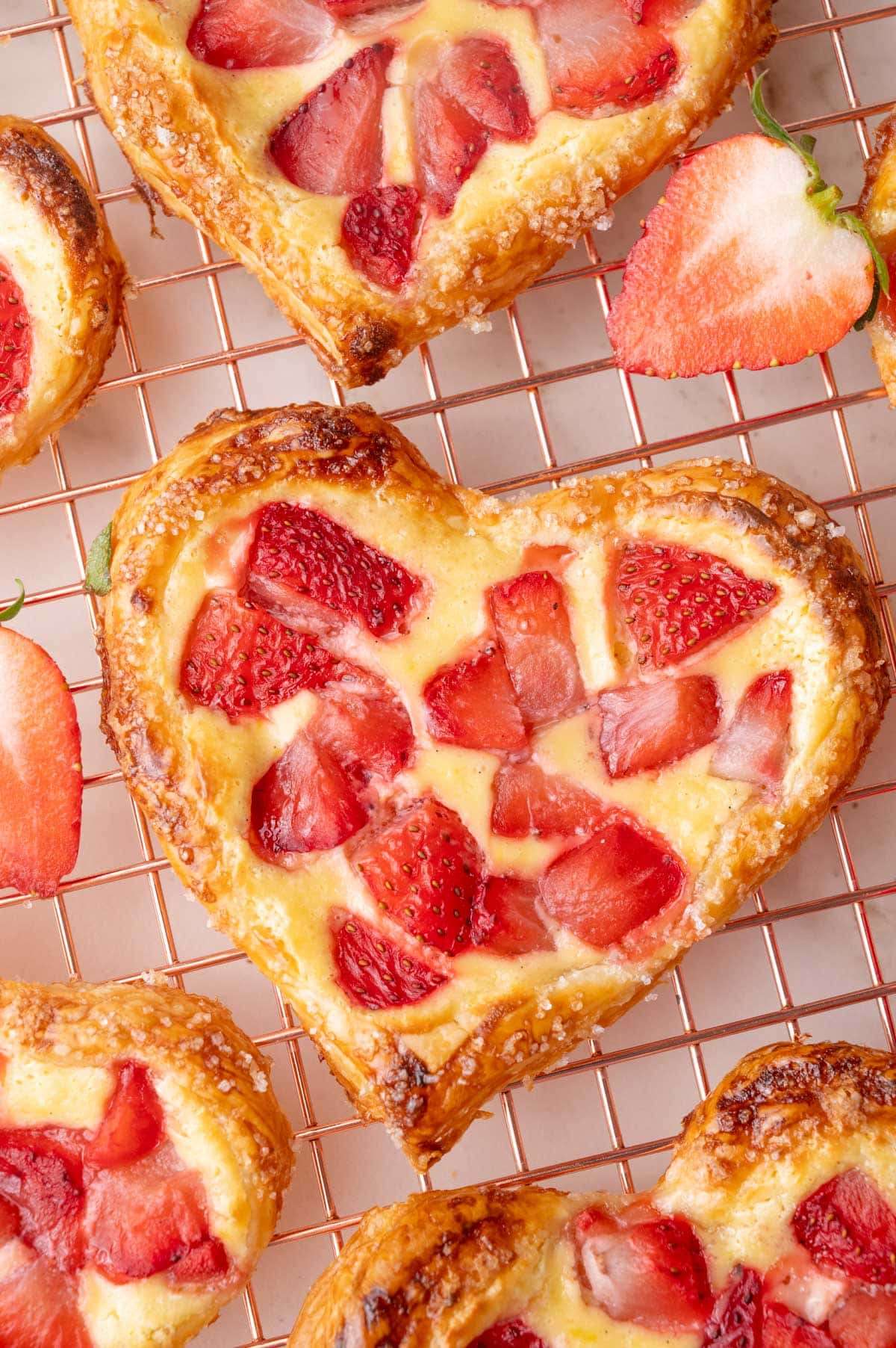 - Take the puff pastry sheet out of the fridge and cut out hearts. They should be about 5 inches (12 cm) long. You can use heart-shaped cutters or cut them out by hand (this is what I did). See photos in the body of the post for reference.
