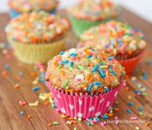 - Combine wet and dry ingredients, stirring until just mixed, do not over stir. Scoop into muffin pans with liners, filling about 2/3 of the way full. Once all cups are full, top with a sprinkle of sprinkles.