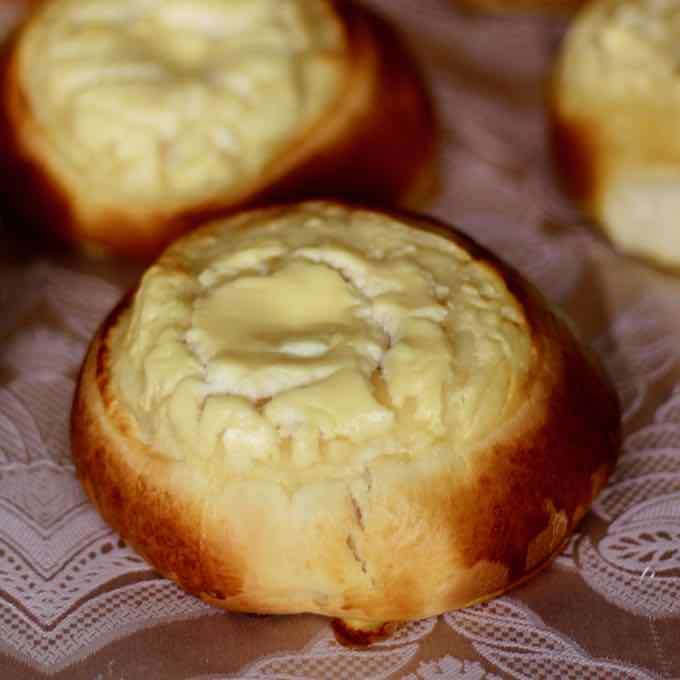 La vatrushka (plural vatrushki) es un pan de brioche relleno de tvaroh o requesón con sabor a vainilla o limón.