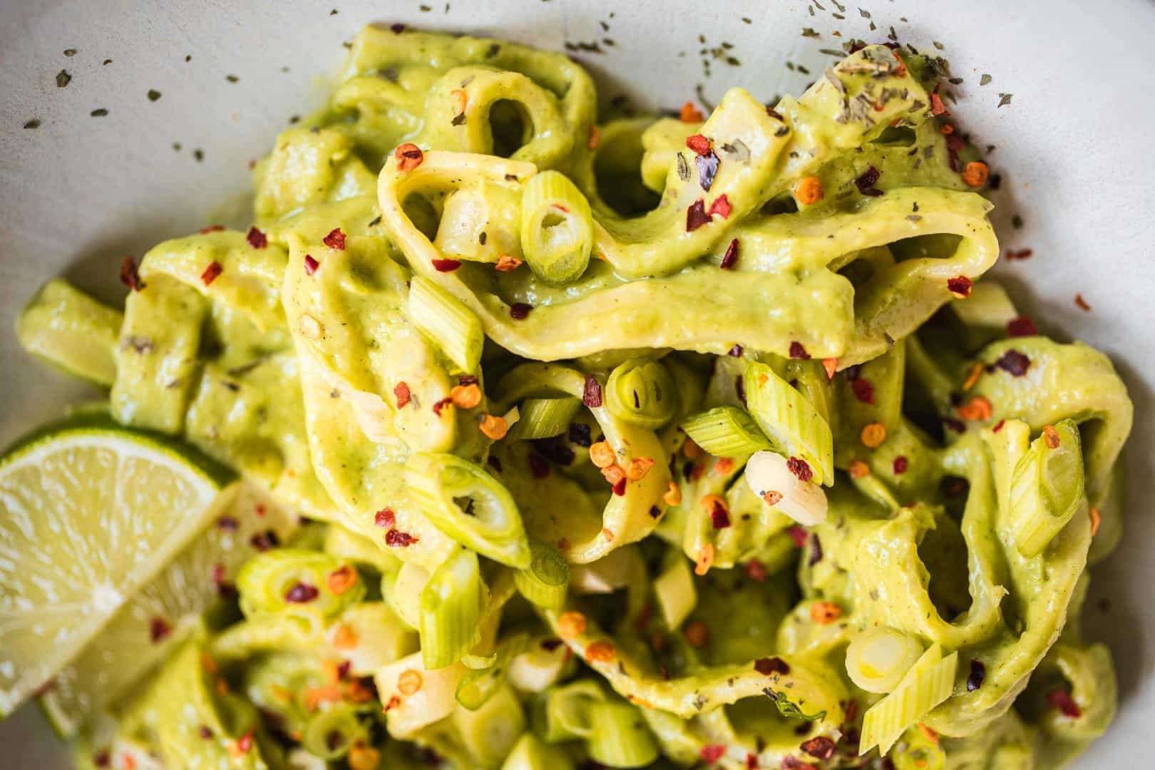 This vegan avocado pasta is great for a lunch or dinner that's ready in just 15 minutes. Creamy, rich and tangy, this meal is entirely dairy-free and easy to make. Gluten-free as long as you use gluten-free pasta.