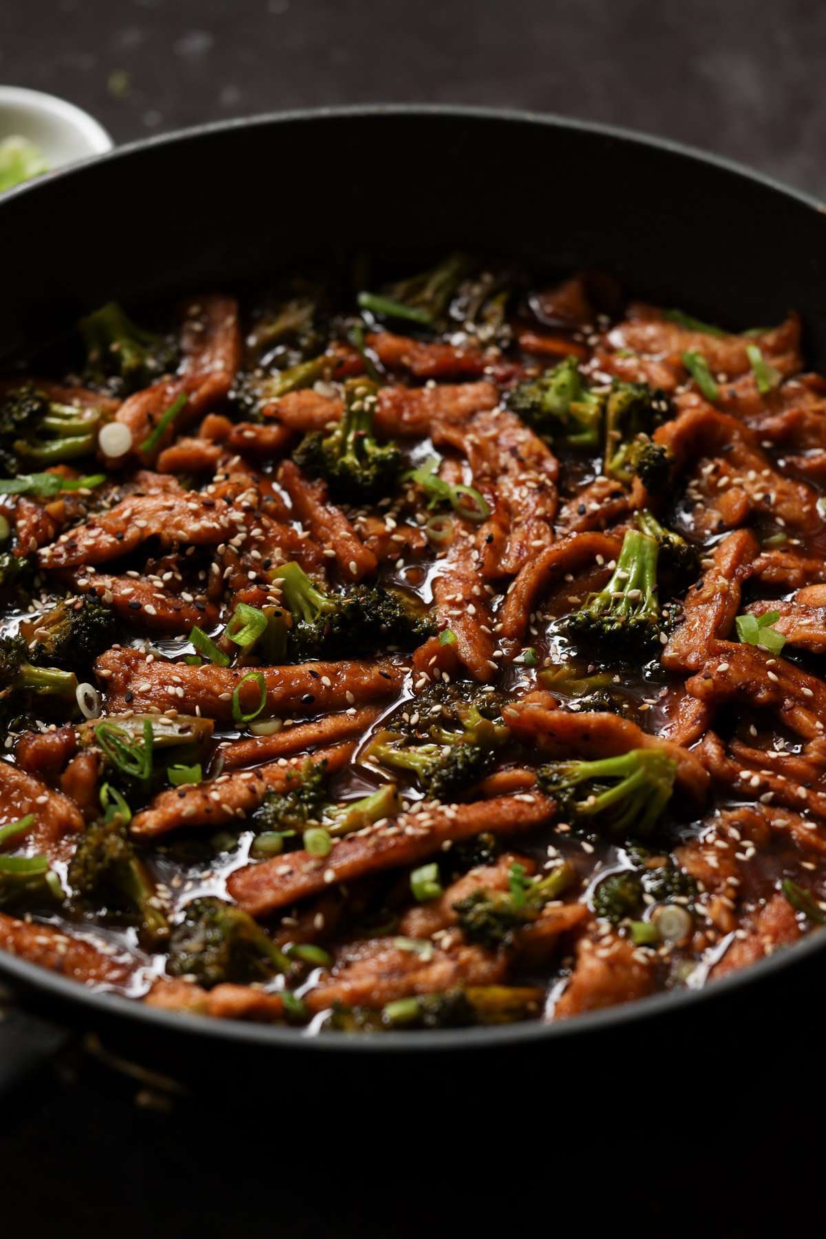 - Heat the same skillet over medium heat. Add the sesame oil then add the garlic and ginger and cook for one to two minutes, or until the garlic is starting to turn golden. Then, add in the broccoli and toss well with the ginger-garlic mixture and cook for half a minute. Add in all of the sauces, brown sugar, black pepper, and 1/2 cup of the reserved stock from soaking the soy curls. Mix well, then cover with the lid, so that this mixture can come to boil and also steam the broccoli, about 3 to 5 minutes. Check if the broccoli is cooked to about al dente, then mix the cornstarch in the reserved stock, and add the cornstarch-reserved stock mixture to the skillet, and bring to a boil.