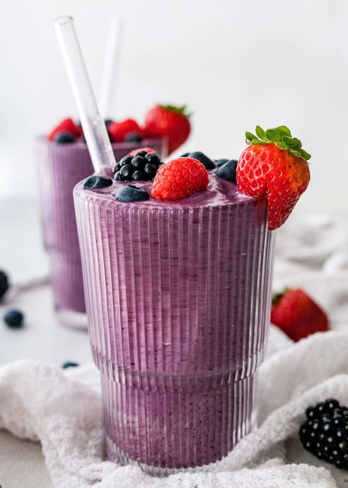 This vegan protein shake combines vegan protein powder with frozen mixed berries, baby spinach, nut butter and chia seeds. No banana needed!