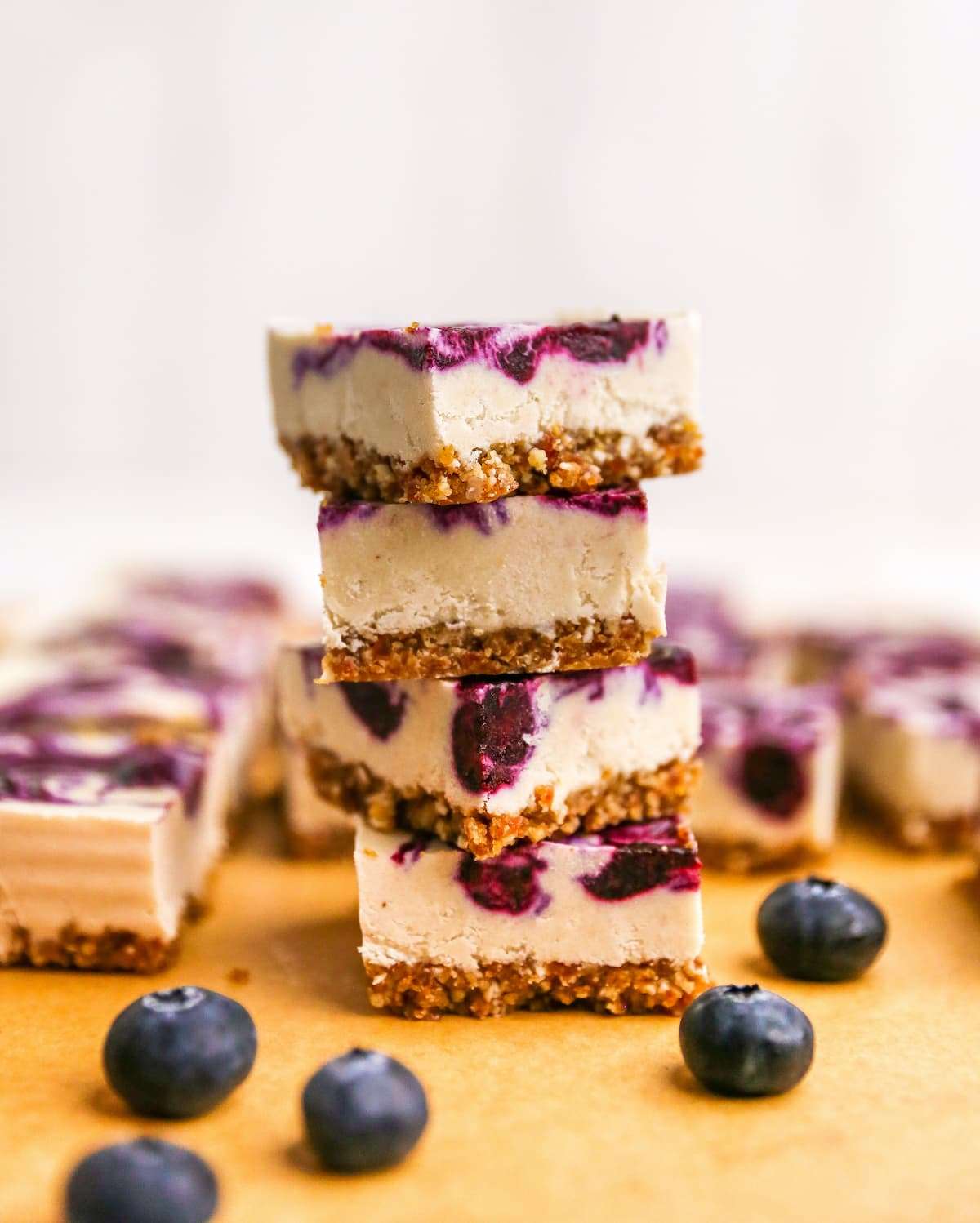 These vegan blueberry cheesecake bars combine a creamy cashew and coconut filling with a date pecan crust and a blueberry swirl topping. They're no bake, gluten-free and absolutely delicious!