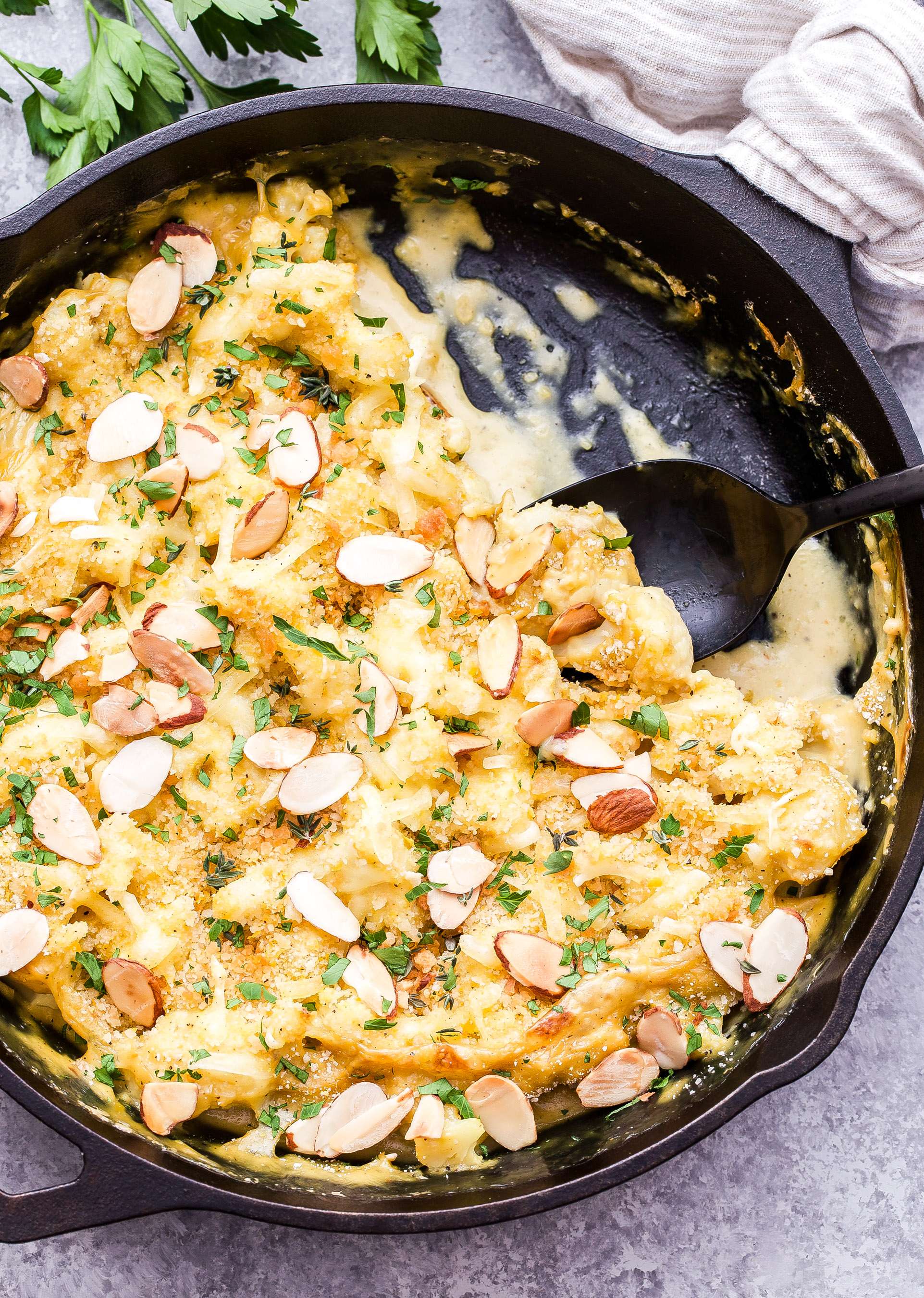 - Add the cauliflower florets to the skillet and pour the sauce over them. Top with vegan cheese (if using it) and then cover everything with the panko topping. Bake for 20-25 minutes or until bubbly and the topping is golden brown. If the topping isn't browned enough, set the oven to broil and bake several more minutes. Remove from the oven and top with sliced almonds, chopped parsley and fresh thyme.