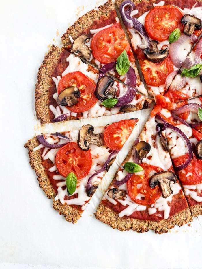 This Vegan Cauliflower Pizza Crust is naturally grain-free, dairy-free, and egg-free. I love how easy it is to make using frozen cauliflower rice and ground flax seeds for a healthy pizza night!