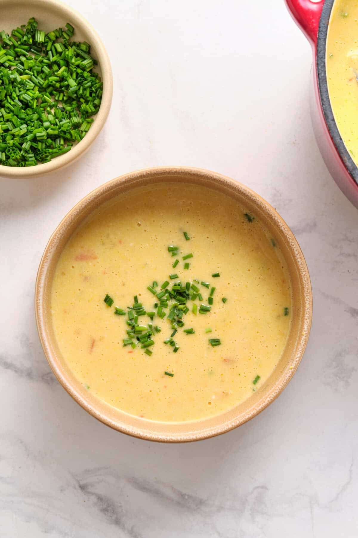 - Season with salt and pepper to taste. Serve hot, garnished with chopped chives.