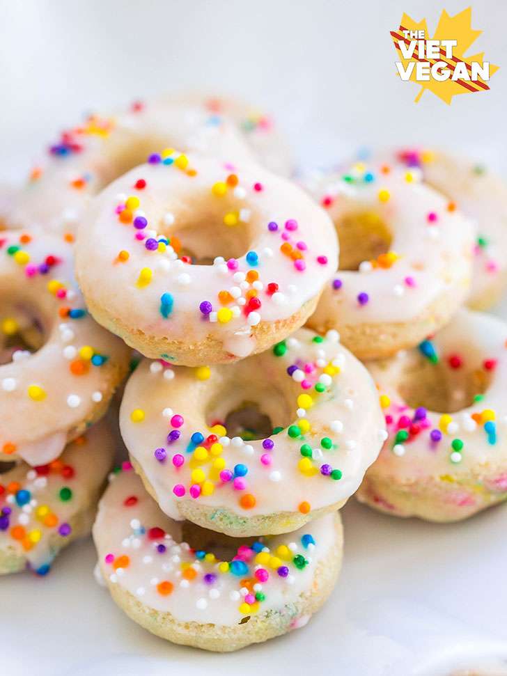 - Fold in 1 tbsp of vegan sprinkles. Transfer batter to a piping bag fitted with a large circle tip. (It should be about the same diametre as the radius of your donut cavities.