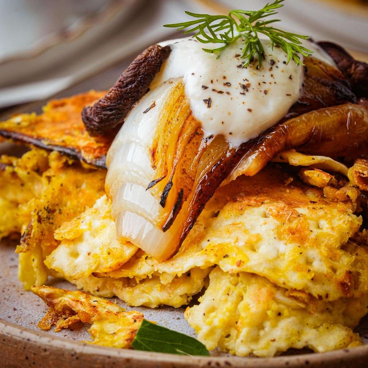 - To serve the matzo brie savory, top with sautéed onions and mushrooms, vegan sour cream, and herbs.