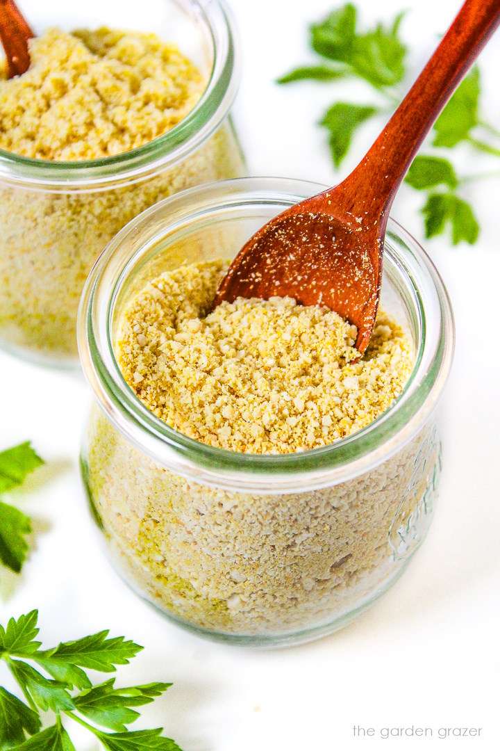 Savory & irresistible! This "parmesan cheese" is made with cashew or almond. Sprinkle it on pizza, pasta, breadsticks, salads, and beyond.
