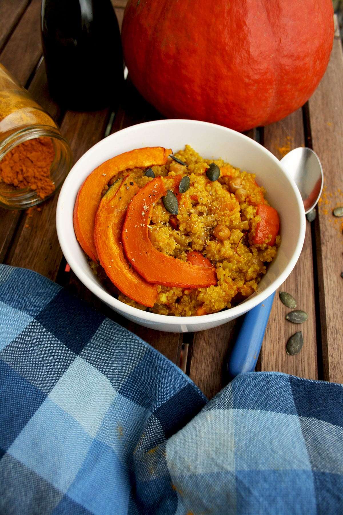 Easy and healthy vegan pumpkin quinoa risotto (quinotto) recipe with chick peas and saffron. Perfect for a quick weekday dinner!