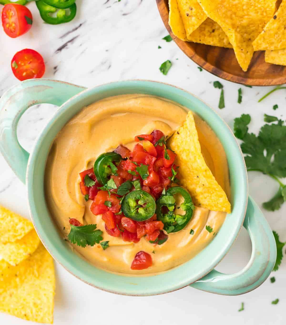 - Serving Ideas: For nachos, drizzle the queso generously over a bed of tortilla chips and garnish as desired (place in the oven for a few minutes to make extra warm if you like). This vegan queso is also delicious over fries, baked potatoes, and roasted vegetables.
