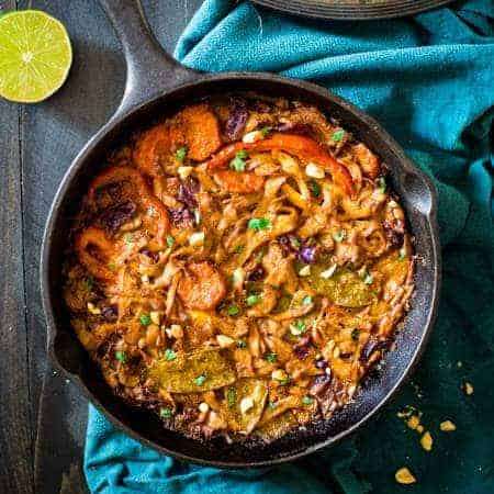 - Add in the peppers, peas, and cabbage and cook for 2 minutes. Add in the noodles and cook for an additional 2 minutes, or until lightly browned.