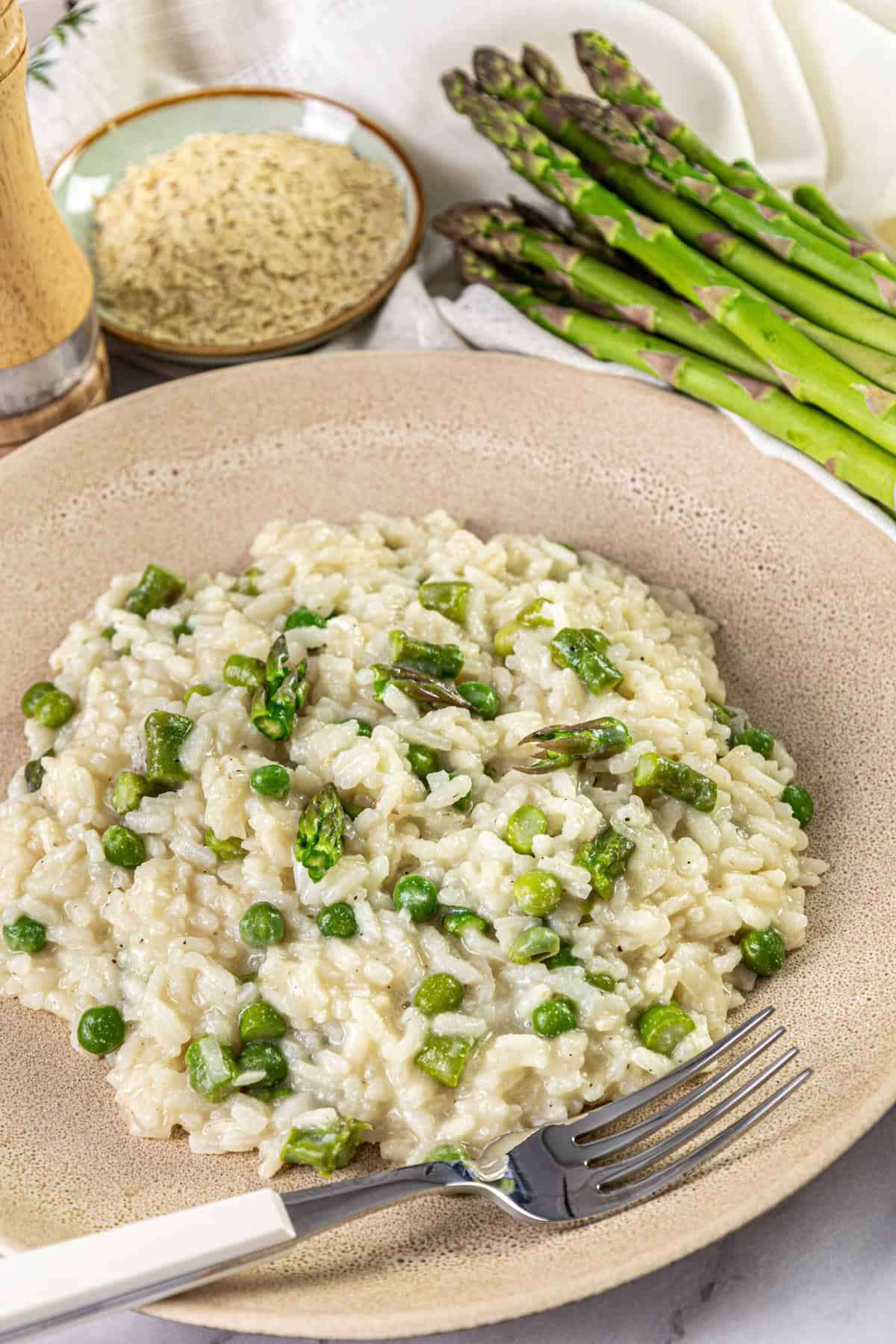 - Halfway through, add the peas and asparagus. Continue adding broth and stirring until the rice is creamy and al dente. This should take about 20 minutes.