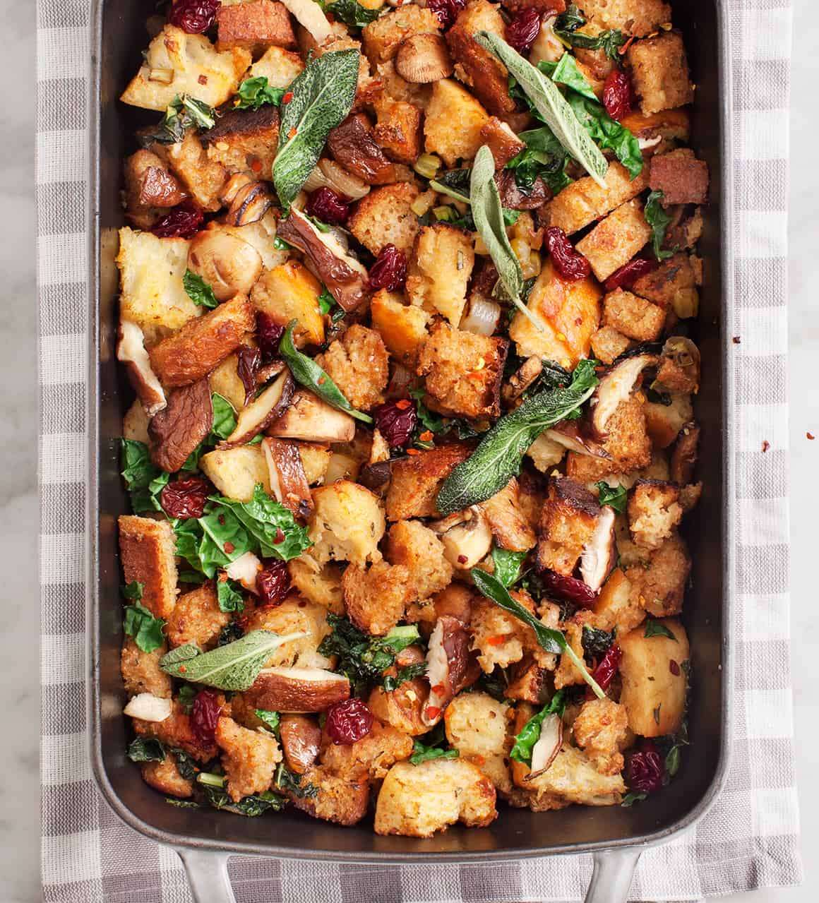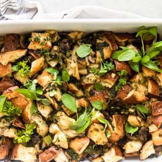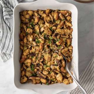 This vegan stuffing recipe is best when it's made with dry, day-old bread. I recommend buying or baking your bread one to three days in advance so that it really soaks up the savory flavor of the onion, celery, mushrooms, and herbs.